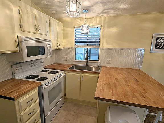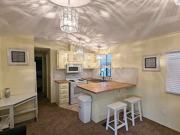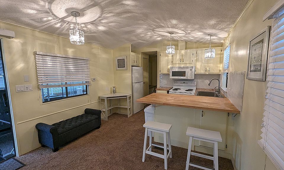 Solid little Park Model/manufactured home for sale in a beautiful, well maintained mobile home park on the East side of Tucson. Tucson Meadows 55+ park shows pride of ownership on each unit in this community. Heated pools year round, gym, suanas & community center with weekly gatherings. This unit has been remodeled this year with bright colors, sealed butcher block countertops & breakfast bar, new wiring & light fixtures, large stainless steel sink & faucet, reverse osmosis drinking water filter installed, upgraded appliances, new (refurbished) Heatpump/AC unit with 1 year warranty, recently sealed roof. Selling furnished with updated blind as well. Car port has washer/dryer hookup or you could use the laundromat at the clubhouse. Monthly lot rent includes water and access to large garbage dumpster. Large storage shed with shelving and electricity. Very nice place to get away from the winters up North or live full time.