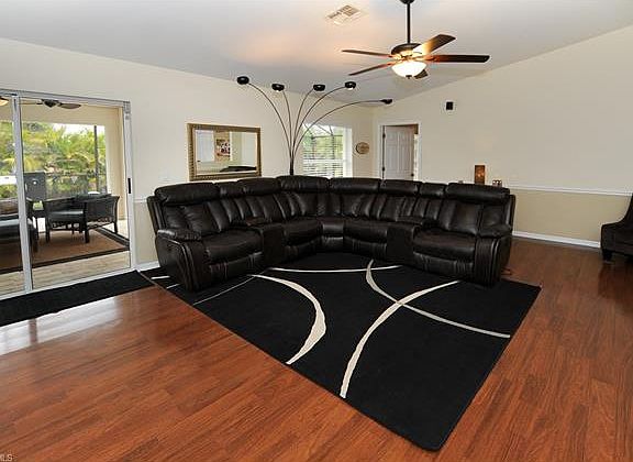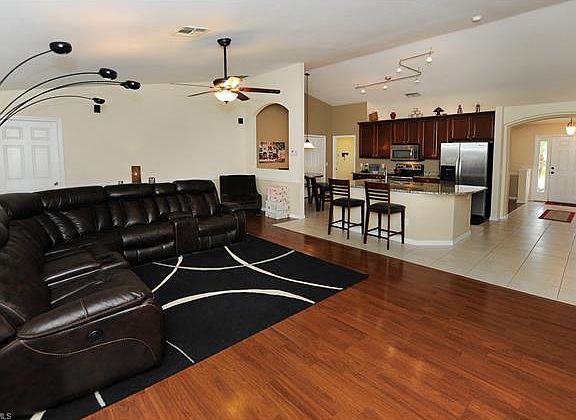 Location Location Location in desirable SW Cape Coral! Immaculate, large 4/2/2 Holiday Home with split bedrooms is conveniently located near shops and restaurants. The open floor plan features over 2,000 sq. ft. of living space perfect for entertaining to include formal dining room. The property was completely renovated in early 2013 to include a new pool with pavers and pool cage with recent addition of a pool heater. Great room consists of large family room, large, open, tiled kitchen w/wet island, breakfast bar & breakfast nook. The kitchen shines with granite counter tops, an abundance of cabinetry and stainless steel appliances. Both bathrooms were redone, the master bath has a walk-in shower and a double sink vanity with a granite countertop. Enjoy being poolside watching TV under the covered lanai surrounded by a privacy of Areca Palm Trees. Pride of ownership is apparent in this well-maintained home. The finished driveway holds numerous cars leading up to a large 2 car attached garage. Fenced yard to run and play for your Four-Legged friends. Trafalgar Elementary and Middle School 1 block away. Cape Coral Sports Complex down the street. The home is on city water and sewer.