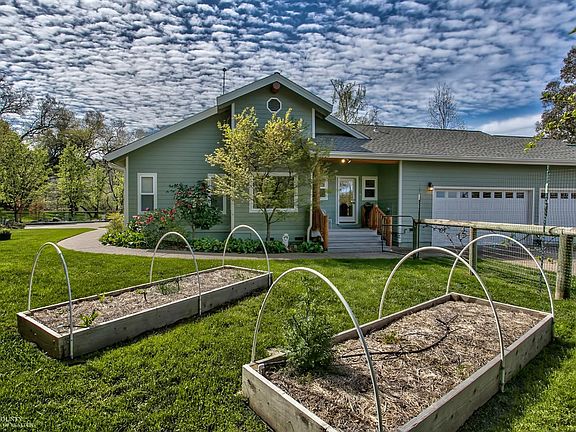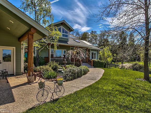 Elegant, yet casual "gentleman's ranch" on five verdant acres of gently sloping pasture with plenty of water, two wells, seasonal stream and pond. Spacious, thoughtfully-designed open floor plan, soaring majestic ceilings that reach upwards with Lodge Pole pine logs. Built with a fine attention to detail and excellent craftsmanship, every room has large windows with views. The 2850 sq foot home has three bedrooms, two and a half baths, large loft with office space or second walk-in closet. The gourmet kitchen, features Dacor and Bosch stainless appliances and granite counter tops. Lots of storage throughout, solid wood doors, built-in hutch and entertainment center, skylights and more. Indoor/outdoor living with patios and decks lead to solar-heated salt water pool and yards. Private, gated, fenced, with a 36 x 36 foot picturesque barn and three horse stalls plus adjacent deer-fenced orchard area. Whole-house solar system brings the electric bill way down! A jewel of a property!