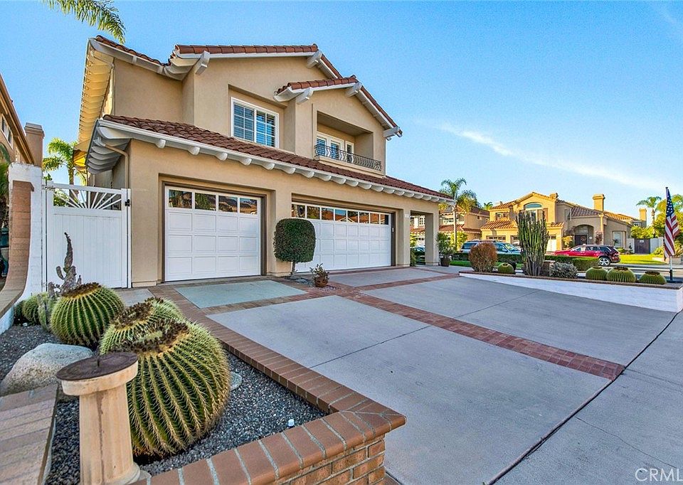 This impressive and stunning 3245 sq ft home is on an oversized 8100 sq ft corner lot. What an incredible opportunity to acquire a beautifully designed and functional home that has everything you are looking for. Gorgeous curb appeal with meticulously manicured front yard and custom brick hardscape. As you enter the foyer notice the soaring ceilings surrounded by large windows that provide an abundance of natural light. Beautiful hardwood floors set the tone downstairs. Elegant step-down living room features a marble fireplace and a formal dining room large enough for all your holiday gatherings. The kitchen boasts granite counter tops, a breakfast bar and nook for casual dining, a 6 burner stove, double convection oven and plenty of cabinets. The open layout connects the kitchen to the inviting family room with brick fireplace. There's a main floor suite with full bath and an extra half bath for guests. The dramatic spiral wood staircase leads you upstairs. Enter the enormous primary suite through double doors and note the vaulted ceilings and bathroom with sunken tub and separate shower as well as dual sinks and a huge custom walk-in closet. Across the hall there are two bedrooms, each with their own full bathroom and one more room that is currently used as a library with direct balcony access. Gaze out your kitchen or family room onto your resort stlyle backyard. Relax and enjoy the exquisitely designed and landscaped tropical oasis with a grass area and planters with mature palm trees. Luxuriate in the solar heated saltwater, crystal blue pool complete with an inviting 8 person spa. The sparkling pool is deep and perfect for lap swimming. For ease of entertaining outdoors there is a brick built-in BBQ, refrigerator, warming drawer, single burner cooktop, and bar seating. Both side yards have an outdoor shower and there are two storage sheds. Additional highlights include dual heating and A/C units for efficiency, vinyl windows, plantation shutters throughout, newer water heater, newly painted exterior trim and patio cover. There is a laundry room complete with cabinets and a utility sink. The attached 3-car garage has plenty of space for vehicles and storage. Huntington Place is a highly desirable gated community near award winning schools including Eader Elementary, Sowers Middle School, Saints Simon & Jude, Huntington Christian and Edison High and recreation center. Located close to the Ocean and river trail. Shop and dine downtown or at Pacific City