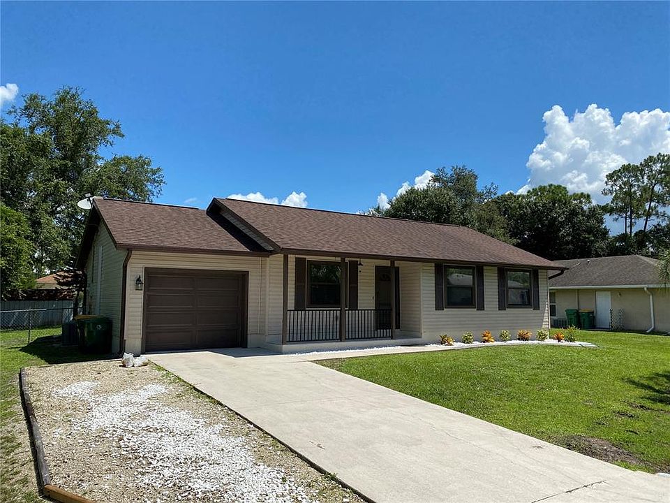 Be sure to click the TOUR 1 icon above to watch the NARRATED VIDEO TOUR. The nice curb appeal with that front porch is just the beginning of what you will love about this gem. Freshly painted, Spic and Span clean, and all those minor maintenance items taken care of - truly ready for move-in. Walking in the front door you will be able to see that this home takes full advantage of its 1092 sq. ft. - a nice great room open to a kitchen that has lovely maple cabinets and a really spacious eat-in area. New microwave/hood and a two-year-old refrigerator are just the start on loving this kitchen. The vaulted ceilings in the great room and kitchen add to the overall roominess of these living areas. And this efficient floorplan comes with 3 bedrooms, each with more closet space than you would expect. The tile and laminate floors are the easiest to keep clean (just trade in your vacuum for a Roomba and sit back). The 16 X 10 master bedroom is graced by a walk-in closet and a bathroom with a nice step-in/step-out shower and a brand new, comfort-height vanity with a marbelite top. The guest bath also has a newer, comfort-height vanity, but it has a fiberglass, 2-piece tub/shower system that is the simplest to clean - just spray and wipe. Need more house than this? Well, the front porch, garage, lanai, and storage shed add ANOTHER 796 SQ. FT., under roof, to the air-conditioned living space. The fenced rear yard not only is the best place for children and pets to play and be secure but has lots of room for almost any outdoor activity - lots of room. The roof was replaced in 2011, so that expensed is deferred for many years. The vinyl siding looks great, and it NEVER has to be painted, so scrub that expense off your budget. Yes, the sewer is connected, and it has been paid by the present owner. Be sure to ask your agent for the FEATURES SHEET that is attached to this listing.