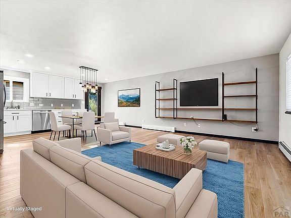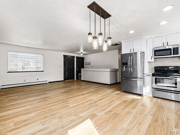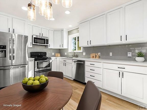 Discover your dream home in the highly sought-after Starlite neighborhood of Pueblo. This beautifully remodeled ranch-style residence boasts 4 spacious bedrooms and 3 bathrooms, featuring luxurious vinyl plank flooring and solid surface countertops. The open floor plan seamlessly connects the living spaces, while the finished basement offers an additional bedroom, bathroom, and family room, perfect for entertaining or relaxation. Enjoy the elegance of contemporary doors and trim, complemented by the meticulously maintained exterior lawn and interior. This home is a true gem waiting for you to make it your own. Some photos virtually staged. This home is a single family home, not a condo or townhome