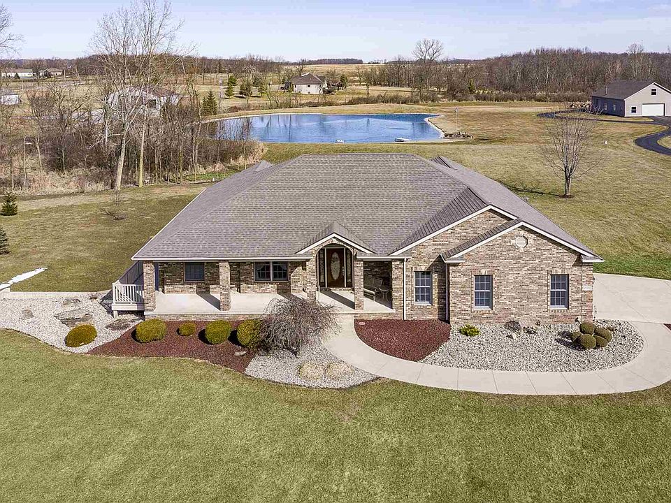 Feel right at home as you enter the gracious foyer that leads into the formal dining room & the heart of the home. The living room is a perfect place to enjoy those cool evenings sitting close by the gas log fireplace. The cook can enjoy working in the kitchen with a view of the back yard. The eat-in kitchen provides the cook with counter space to work, bar & table space with French doors that open out to the deck. From the wrap around deck there is a picture perfect view of the pond. The master suite is fit for royalty! His & her walk-in closets, view of the yard & pond, a jetted garden tub, make up area & walk-in shower. Two other bedrooms & a full bath are located on the main floor along with the laundry room complete with a utility sink. All hall ways & doors (36 in) are wide as well as the stairs leading to the finished walk-out basement. There is a kitchen, dining area & family room that are perfect for a family or entertaining. The 5th bedroom is currently used as a spacious office. The lower level, full bath offers a separate area for the sink from the toilet. Exit the family room onto the covered patio. Surround sound through out the house, front porch & patio. All closets through out the house are large. Out side wood burner is used as a second heat for the house. If buyer doesn't want the wood burner the seller will remove it from the property. Behind the pole barn is a 40x40 black top area. There are 2 over head doors, work benches, ceiling fans, wood burner & stairs to 2nd floor storage area. The pond is 14 ft deep. Pier & beach area for those hot summer days. There are gas & electric hook ups for kitchen stove & dryer. Washer & dryer are included in the sale. Fall of 2019 new shingles were put on house & pole barn. Gutters are drained out away from the house. Black top drive from road to pole barn with cement drive at attached garage.