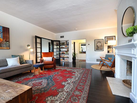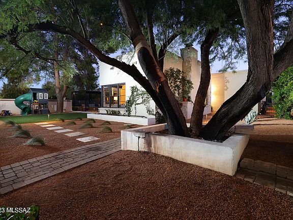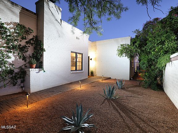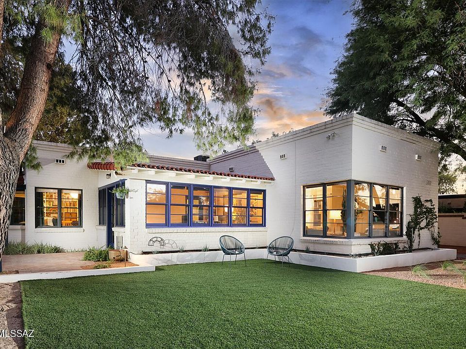 Beautifully updated Art Moderne in the heart of Blenman-Elm historic neighborhood, walking distance to Arizona Inn and Banner University Hospital, and a short streetcar ride from downtown. This 1954 Arthur T Brown designed brick home offers a blend of historic features and high-end modern updates. Enter the walled compound under the canopy of mature trees.. At the front of the home, the large living room with wood burning fireplace, and the adjacent Arizona room feature floor-to-ceiling windows that look out onto the Catalina mountains in the distance, and the landscaped front yard with custom steel pergola & brick patio. The house wraps around a central private courtyard, allowing natural light to stream through large windows and glass paneled doors into nearly every room of the house. Open floor plan kitchen and dining room are built for entertaining. The chef's kitchen impresses with Boos block and Vermont soapstone countertops, original St Charles cabinets, a fully-apportioned Viking range with six gas burners, griddle and two ovens, built-in Subzero fridge and a dual-zone wine fridge. The dining area looks onto a shaded patio and fireplace. The primary bedroom is tucked away in its own wing, with a large dressing room lined by custom closets, spacious bathroom with soaking tub and large study (or nursery) with bay window and wall-to-wall bookcases. The central bedroom features a bay window and adjacent bathroom, while the guest bedroom (doubling as an office) on the west wing has its own exterior entrance and nearby full bathroom. In the backyard there is an in-ground 'spool' that serves as a spa in the winter and dipping pool in the summer, and a detached open-ended studio. The finished garage functions as a bonus room with built-in storage cabinets, mini split AC, and EV compatible plug. Owners have made numerous recent updates (whole-house updated plumbing and electric, custom windows and doors, and other upgrades listed in the documents tab) which will allow the new buyers to continue enjoying its classic features with confidence in its comfort for many years to come.