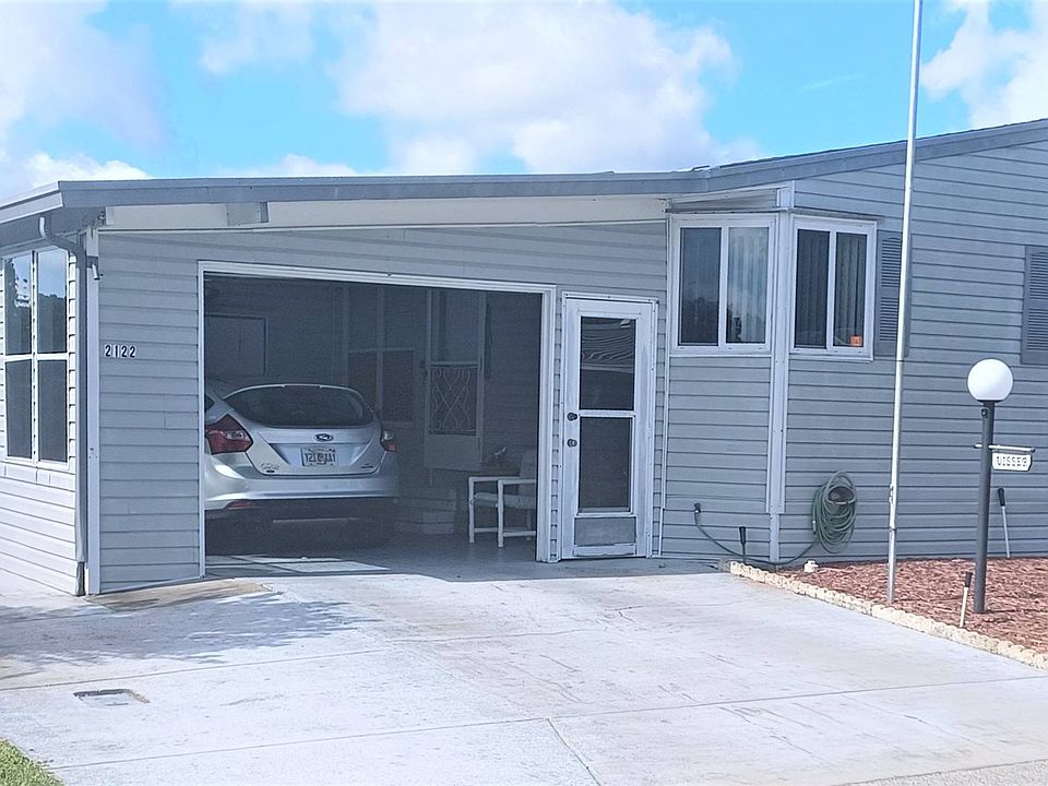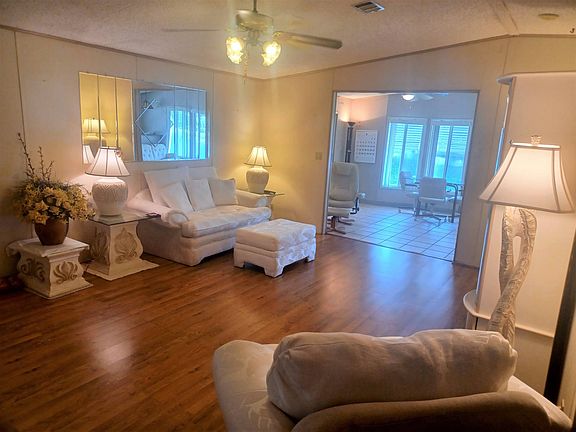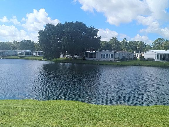 This 1990 Palm Harbor home has the most amazing water view, and features a large sunroom with a wall of windows, a lanai and a concrete patio so you can appreciate the beauty in more than one way! And, the sunroom includes a bar area with slider door access to the second bedroom, creating a private little entry point. The spacious interior is nicely laid out with 1456 sq ft of living space, which is carpet free ... the living room and both bedrooms include vinyl flooring; all wet areas have tile. The generously sized master includes an adjoining bath with lots of counter space and separate vanity area. All this inside, plus a garage and oversized golf cart shed outside. The home is being offered furnished.