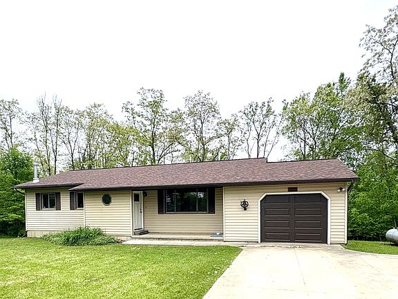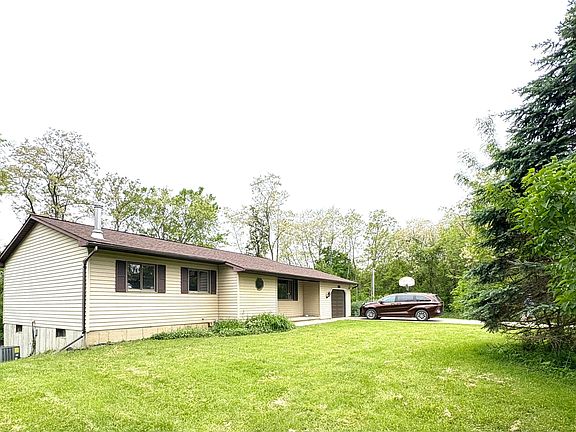 Move to this sun-filled ranch home on nearly eight acres and start your mini farm! House has been renovated top to bottom: New roof ('22), new kitchen & baths ('17). Updated kitchen is HUGE with a large breakfast room / dining area. Three bedrooms and two full bath. Spacious basement (full footprint of home) has egress windows, a bedroom, wood burning fireplace and walkout doorwall. Put in your new flooring and you are ready to go, having doubled your functional living space. Outside, there is a large fenced in area connected to the home to keep all two and four-legged friends safe. Additionally there is lots of manicured open space with existing garden space, and room for much more! Mature trees on the rest of property create lots of privacy. Pond hidden in woods! Come on home!