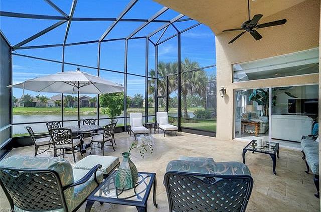 LIGHT & BRIGHT!!! This immaculate "Swan" is located on a prime and oversized Lake Front lot with SOUTHERN EXPOSURE! You will love the brand new extended & screened Lanai, complete with Travertine flooring and long lake views, making it the perfect area for entertaining family & friends. Inside, you will find 11' ceilings throughout the common areas and multiple transom windows, filling the home with tons of natural light. The kitchen area is open to the Family Room and Eat In Kitchen area. The Master Suite offers lanai access, 12' ceilings, tray ceiling detail, this and her walk in closets, and bath with Corner Soaking Tub, Dual Vanities, and Walk In Shower. Other fine appointments include Marble Look Diagonal Tile floors, Electric Window Shades, Granite Countertops, Plantation Shutters, and more! Saturnia Lakes offers a heated resort pool, lap pool, kiddie pool, hot tub, fitness room, dance studio, internet cafe, saunas, massage rooms, billiards room, grande ballroom, 4 clay tennis courts, playground, basket ball court, putting green, and miles of walking paths. Only 1.5 miles east of I75, 12 min to the Beach & 41, 20 min from Downtown Naples.