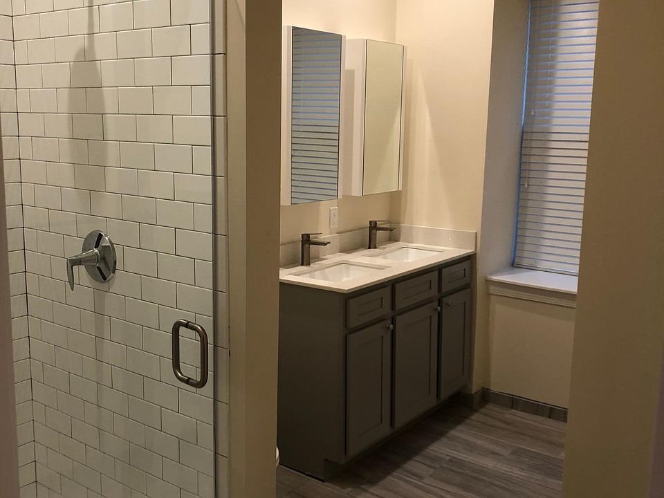 New Construction located in the heart of Rittenhouse . This 2 bedroom den with 1.5 baths is decked out with modern finishes in a beautiful historic building 2 blocks from Rittenhouse Square. New wood floor throughout, beautiful kitchen with stainless steel full size appliances, gray quartz countertops over white cabinetry with tile backsplash. The bathroom is outfitted with frameless glass door and white subway tile with glass accents, spacious double bowl vanities and med cabinets. The unit has central heating and air, in unit washer dryer , full size hot water heater, and intercom system. The entrance to the building has a grand fire place and lots of refurbished stained class and beautiful woodwork.
