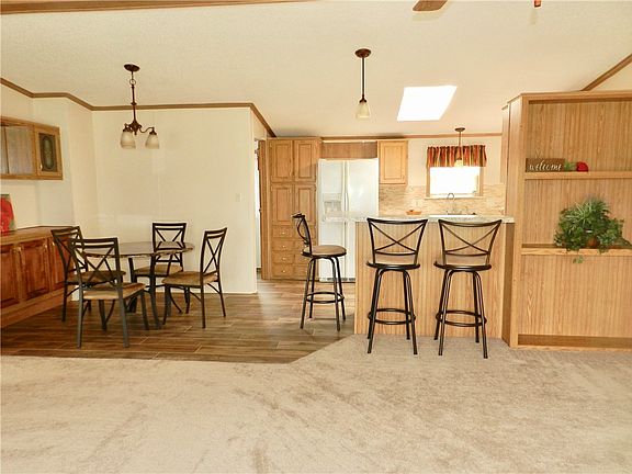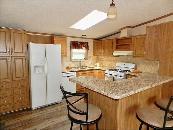 Enjoy simplicity & unsurpassed style in this completely updated, move-in ready manufactured home embraced in maintenance-free vinyl siding and complimented by a new metal roof. The sun-drenched living room is underscored in new neutral carpeting and illuminated by triple windows. Living room opens to a fully-equipped, oak kitchen showcasing abundant cabinetry, new granite-look counters, travertine backsplash, resilient wood-grain vinyl-plank flooring, pendant lighting, eat-at breakfast peninsula and an intimate dining venue. The owner’s suite is accompanied by a lavish en-suite bathroom underscored in wood-grain vinyl laminate and accentuated with an oversized vanity/linen cupboard combo topped with granite countertop and backsplash, soaker tub, shower and walk-in closet. A second updated full bathroom is complimented by wood-grain flooring, bright white vanity & a cultured marble counter. A laundry room is conveniently located off the kitchen completing the well-designed floor plan.