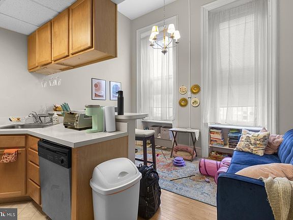 Welcome home to this bright and cozy one bedroom / one bathroom condo at 2122 Spruce Street. Located in a stunning brownstone, this condo is on the first floor of a small multi-unit building. Entering the condo, you'll immediately notice the ample sunlight you get from the large windows at the front of the unit. The kitchen features stainless appliances including refrigerator, oven with gas range, mounted microwave, and dishwasher. There is a breakfast bar that overlooks your living space, which is a great way to connect the two areas and make use of this cozy space. In the rear of the unit is the bedroom. While small, this bedroom is mighty with tall ceilings, large window, and closet space. Continue on and you'll find the in-unit combo washer/dryer unit. Finally, at the very back of the unit is your full bathroom with tiled shower/tub and vanity. This rare gem in the heart of Rittenhouse Square sits on a quiet cobble-stoned, historically protected street, surrounded by stately million-dollar townhomes. This part of Spruce Street is a favorite filming location, with Apple TV the latest to do so. The condo features high ceilings and hardwood floors with a breakfast bar, along with basement storage. Near restaurants and shops, the condo is also a few blocks from the Schuylkill River walkway and a dog park, with two supermarkets nearby. Walk to UPenn over the nearby Walnut St. bridge. Street parking is available; a nearby parking lot is available as well. Condo fee is $130 a month