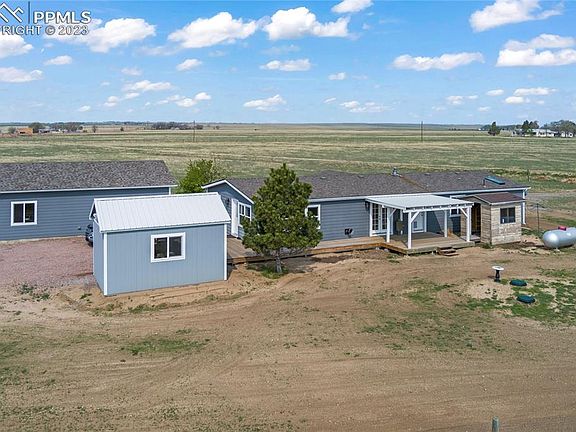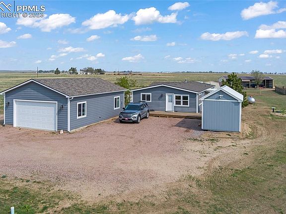 What a beauty this property is! 3 bed, 2 bath 1742 sq. ft ranch style home on 40 acres with a fantastic view of Pikes Peak! In 2019, the house was upgraded from one end to the other: new windows, doors, insulation, sheetrock, siding and fresh paint inside and out. Also new lighting, flooring, USB outlets in the kitchen, dining, and living room; central A.C., new kitchen cabinets with soft close doors and slides, granite countertops. Both bathrooms were remodeled and updated. New appliances in 2019 include a Frigidaire Gallery-style refrigerator, a convection range oven, and a built-in dishwasher The built-in microwave oven is only 3 months old. Pellet stove in 2019 and new furnace in 2018 The amazing 24x34 insulated and sheet-rocked garage will keep your cars and toys out of the weather, and/or you can use it as a workshop. A new 10x16 shed is insulated, sheet-rocked, and has shelving. it was used as a craft working space. Enjoy the beautiful sunsets from the spacious 10x24 front deck with a railing. A 12x16 covered deck is at the rear of the house, wood walkways connect the two. Other outbuildings include a 16x60 open-sided barn/shed, a 16x16 metal-covered shed, and two 8x8 sheds. A 32x64 fenced area for gardening rounds out this gorgeous property.