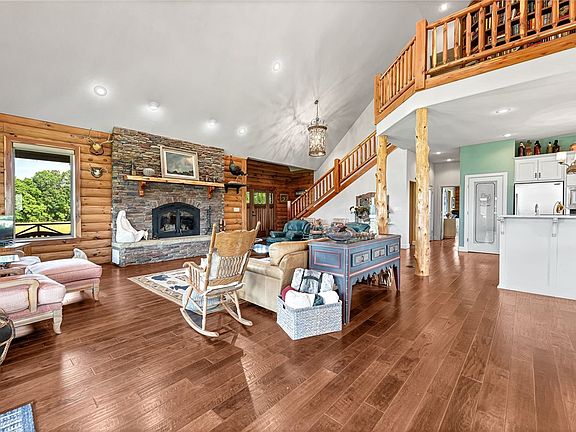 Dream Log Home! This outstanding masterpiece has full log walls, soaring ceilings, Custom Light fixtures, large fireplace, open living area and library loft, Bright fully equipped Kitchen, duel pantries, gas 6 burner Jen-Air cook top, prep sink, pot filler, farm sink, wired for ice machine, Full Fridge and full freezer, stunning Laundry!!! 1st level Main bedroom suite! upper level has 2 beds, 1 bath and a loft, basement has 2nd living room, large 4th bedroom/ craft room and bath with locked cedar lined closet. also, 635 sq ft unfinished storage/equipment room. Now for the 2nd best part!!!!! 40'x60' log sided shop w/ Kitchen, half bath and wood stove! All Roofs replaced 2023 plus, logs and wrap-a-round 10' porch re-stained in 2023. The land features hay fields, woods, and Corps of Engineers Beaver Lake frontage at the back of property.