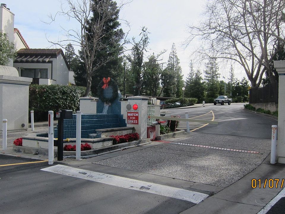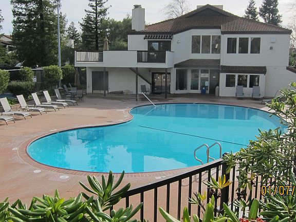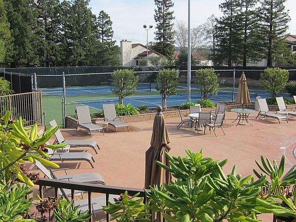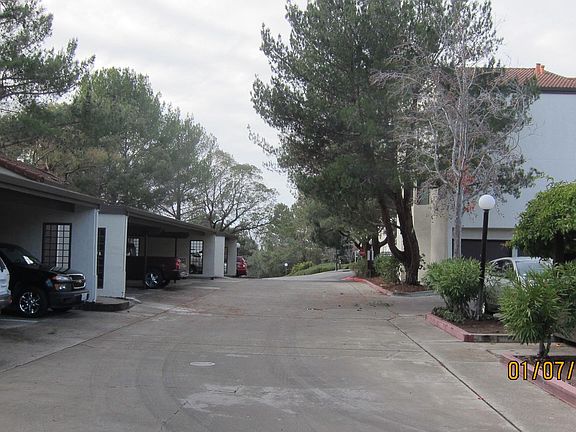 Top level with view of the hills. Living room with pitch ceilings and fireplace and balcony off living room. Dining area off kitchen. Kitchen with oven/range, dishwasher, disposal, refrigerator and lots of cabinets. Parking: carport with storage and restricted permit 1 space open parking. Complex is gated and has pools, tennis courts, spa, saunas exercise room, pool table, ping pong table and clubhouse. owner pays water & garbage. month-to-month