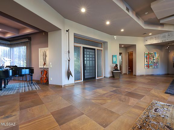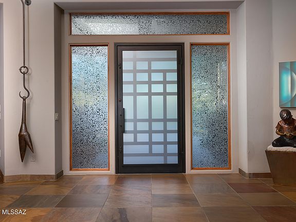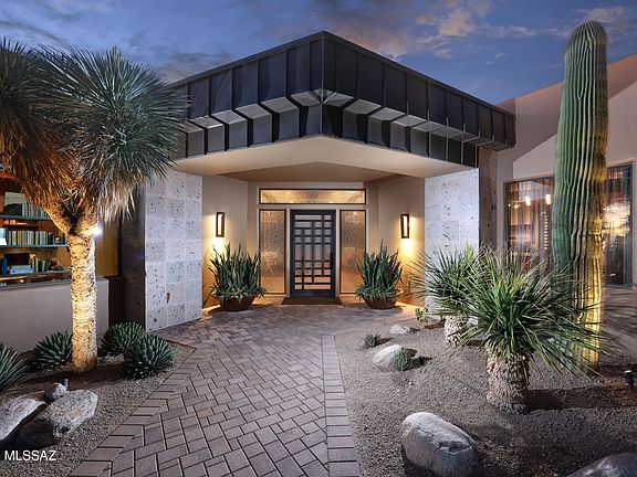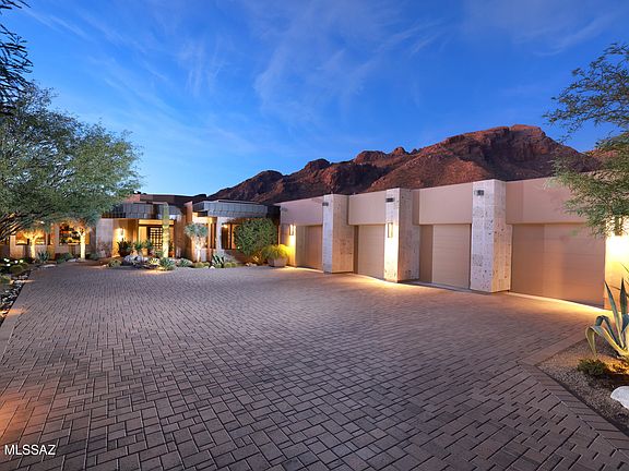 Presenting an architectural marvel in the prestigious guard-gated community of Pima Canyon Estates, offering an unparalleled fusion of sophisticated design and natural desert beauty. Nestled amidst panoramic views of the rugged Catalina Mountains, this stunning 6,300+ sq ft Southwestern Contemporary exudes elegance at every turn. With a commanding presence, this 5-bedroom, 5-bathroom residence is a sanctuary of style and comfort, designed to elevate modern living.Step into a sunlit haven, where expansive windows, soaring ceilings, and 24x24 sandstone flooring create a luminous, airy ambiance. The chef's kitchen is a masterpiece in itself, reimagined with impeccable attention to detail: custom cabinetry, sleek quartz countertops, a refined tile backsplash, and premium appliances including a Sub-Zero refrigerator/freezer, dual Viking ovens, and twin Miele dishwashersensure every culinary experience is exceptional. The luxurious primary suite is a retreat of unparalleled comfort, featuring a marble-faced fireplace, retractable solar sunscreens, and custom shades for optimal privacy and elegance. Off the dining room, a show-stopping glass and mahogany wine cellar creates an intimate setting, perfect for hosting conversations over your favorite vintages, all maintained at ideal temperatures with dedicated climate control. Step outside to an oasis of tranquility and luxury. The meticulously landscaped grounds are a testament to masterful design, featuring lush desert flora that seamlessly blends with the natural surroundings. The custom cedar-lined ramada with sandstone flooring provides a serene setting for outdoor relaxation and entertainment. Here, you'll find a sparkling pool and spa that invite leisurely afternoons, while expansive patios offer breathtaking mountain vistas. This meticulously curated home is further enhanced by a state-of-the-art audio/video system, new chandeliers, and custom cabinetry in the office. Enveloped by professionally designed landscaping and thoughtfully upgraded to perfection, this residence epitomizes refined desert living. Experience the height of luxury in Pima Canyon Estatesschedule a private showing today.