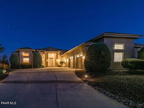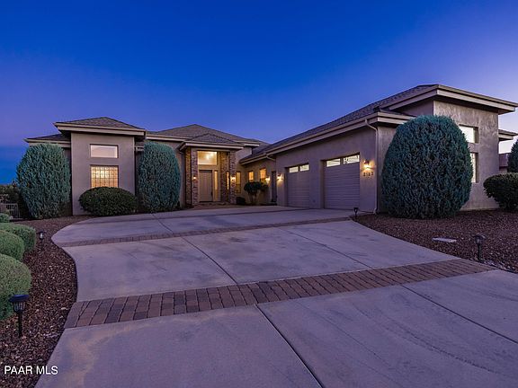 Located at the end of a sleepy cul-de-sac and on a fairway, this elegant home boasts spectacular views of the golf course and surrounding mountain vistas! Enjoy outstanding views of Bradshaw's, Mingus Mtn, and Glassford hill from the floor-to-ceiling windows in the great room! This beautiful home features single-level living with an open & spacious split bedroom floorplan with a great room design concept! The interior has imported custom walnut cabinetry with raised panels, solid core doors, ceiling fans, surround sound speakers, gleaming laminate flooring, and custom transom windows throughout the majority of the home. The great room floor-to-ceiling windows provide lots of natural light and are on automatic shades. CONTINUE The gas fireplace is accented by floor-to-ceiling stack stone accents with built-in media niches. The beautiful kitchen boasts gleaming granite countertops, stainless steel appliances including a four-burner Jenn-Air gas range/oven with warming drawer, an appliance garage, glass-front cabinetry, crown molding, two pantries, and a generously sized island. Additionally, there is a convenient built-in office desk just off the kitchen. The spacious master suite has vaulted ceilings, a gas stack stone fireplace and offers the same stunning views overlooking the beautifully manicured backyard including a water feature and mature trees. The master suite also features recessed lit alcoves/niches and a massive walk-in closet with built-in shelving. The master bathroom includes raised height dual/separate vanities, a powder area, a contemporary snail shower with rain glass block windows and dual shower heads, a luxurious jetted tub, and a linen closet. The guest bedroom is spacious in size and has a private full bathroom attached with a comfort height toilet and raised height vanity. An additional oversized craft/hobby room has extensive built-ins including a sewing machine cabinet and storage cabinets above. The laundry room provides lots of storage with its extensive cabinetry and has a handy utility sink and hanging bar. The oversized two-car garage features insulated extra high overhead doors, epoxy flooring, extra electrical circuits and convenience outlets, and a door leading out to the back/side yard. The lower level of the home is perfect for extended stay guests with a bonus/flex/media room with a gas fireplace, wet bar, ample built-in cabinetry, refrigerator, and microwave. The lower-level master suite has a huge walk-in closet and private access to the lower covered patio. The ensuite full bathroom has a raised height dual vanity and powder area. This lower level also offers another large utility room/second laundry room, unfinished storage closets, an additional massive bedroom with an oversized closet & dedicated patio access, and a bath with raised height vanity and comfort height toilet. The lower-level garage is an oversized, extra deep one car with a utility sink, built-in cabinetry, and an insulated overhead door. The lower garage has access from a side driveway that runs on the east side of the home. The backyard features stunning golf course/mountain views, a remote/WIFI controlled water feature, mature towering trees, a massive covered top deck, and a lower-level paver concrete patio leading out to the golf course. Additional amenities include a hard-wired alarm system,75-gallon gas hot water heater, rain gutters, copper plumbing, fire sprinkler suppression system, additional electrical panel, four-zone HVAC, an impeccably maintained central vac, a larger flat driveway, and beautiful stack stone-accented columns.