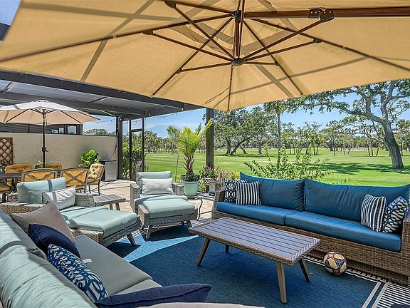 This beautiful, maintenance free, golf course villa in the Bay Isles Harbor Oaks community on south Longboat Key is a golfer's dream! The oversized enclosed patio with travertine tile flooring in the back has a panoramic "Open View" screen window that gives you front row seats to the Longboat Key Club golf course and gorgeous sunsets. This first floor three bedroom, three bath condo has been totally renovated from top to bottom. Walls were removed to provide an open floor plan between the living, dining, and kitchen areas. Hurricane impact windows and doors were installed as well as driftwood looking plank tile flooring. Fresh and bright, the kitchen has beautiful white custom wood cabinets, quartz countertops with complementary backsplash tiles, stainless steel appliances, pendant lighting, and a large island with seating for five. Separate living spaces include a cozy sitting area for drinking your morning coffee or reading, a large dining area with a wood burning fireplace and a comfortable family room for watching your favorite TV shows, sports events or movies. A small, private office is tucked away off the family room. All of the bedrooms are ensuite with beautiful bathroom selections including the vanities, custom tiles, lighting, and flooring. A renovated two-car garage with a blue-gray epoxy flooring, custom cabinetry, overhead storage, and a wall storage system gives this condo the benefits of a single-family home. Other elements of this home include a laundry nook with full size washer and dryer and a small attic space for extra storage. Located directly across the street is the heated community pool. Bay Isles has two 24-hour manned security gates and a private gated beach club with a covered pavilion with picnic tables, bathrooms, beach chair storage, BBQ grilles, plenty of parking and endless sunsets on the beach. Harbour Oaks has just changed their pet policy to allow one dog up to 50 lbs. and one cat. Close proximity to shopping, restaurants, banks, fitness centers, tennis/pickleball and golf.