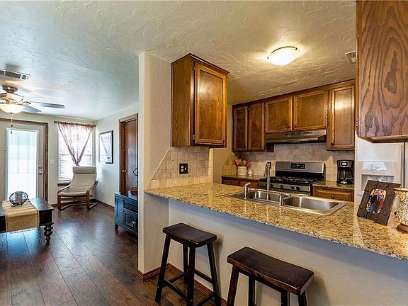 CUTE! COZY! AND MOVE IN READY! THIS DUPLEX OFFERS MUCH MORE THAN YOU COULD IMAGINE! FEATURES INCLUDE, GRANITE COUNTERS, BREAKFAST BAR, GAS RANGE, LOTS OF CABINETS, TWO LARGE BEDROOMS WITH WALK-IN CLOSETS AND BOTH WITH ACCESS TO FULL BATHROOMS, NICE WOOD FLOORS, CARPET IN BEDROOMS, TILE IN BATHROOMS & KITCHEN, ONE CAR GARAGE, A STORM SHELTER, AND A BEAUTIFUL YARD!!