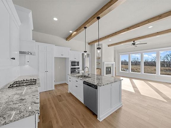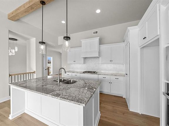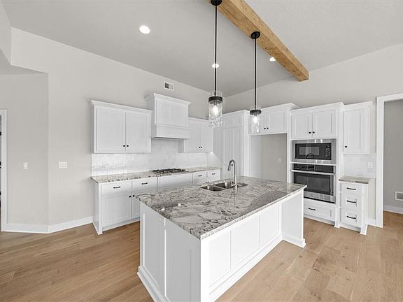 Discover the Hampshire plan, designed to cater to a wide range of buyers. From the moment you step inside, you’ll appreciate the seamless flow and open sight lines connecting the kitchen, great room, and dining area. The well-appointed kitchen features a complete five-piece appliance package, a walk-in pantry, and a large island ideal for entertaining. The master suite is a luxurious retreat, offering a four-piece bath with double vanities, a fully tiled shower, and an expansive closet. Conveniently located between the mud hall and master closet is the laundry room, ensuring ease of access. The lower level is perfect for living and entertaining, with two additional bedrooms, a full bath, a built-in wet bar, a spacious Rec room, and a gaming area. Enjoy outdoor living with a covered deck and patio that provide a great connection to nature Situated on a walk-out lot backing to mature trees, This home exemplifies top-notch design and craftsmanship. This custom home, located in Hook Farms—Hunt Midwest’s newest and fastest-growing community in Lee’s Summit—boasts over 65 acres of green space, a community pool, wooded walking trails, and an upcoming community garden. Residents benefit from attendance in the highly acclaimed Lee’s Summit schools, including Lee’s Summit West.