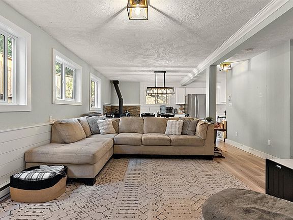 Welcome to your perfect lakeside escape! Tucked away on a quiet no-thru road, this beautifully updated cottage-style home is perfect for young families! Upstairs, you'll find three spacious bedrooms and a freshly renovated bathroom, complete with modern touches. The primary bedroom is a true retreat with stunning lake views that greet you every morning. Downstairs, the heart of the home features a stylish, updated kitchen with stainless steel appliances, a cozy coffee station, and an inviting dining area warmed by a wood stove—perfect for gatherings year-round. New flooring flows into a bright and cozy living room, where charming shiplap walls add a touch of timeless cottage character. There's ample space for parking your boat, RV, and more, along with covered storage under the patio for firewood and all your outdoor gear. This home offers the perfect blend of comfort, charm, and location—don’t miss your chance to experience lakeside living at its finest!