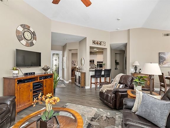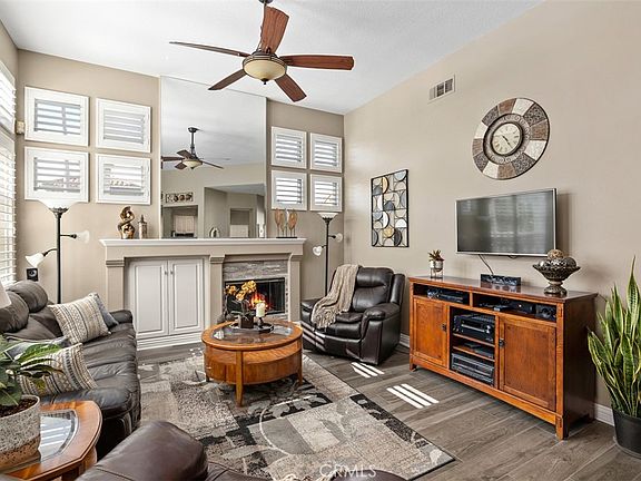 The large living room has a lot of natural light, plantation shutters, vaulted ceilings, beautiful fireplace, with plenty of room to entertain guests. Adjacent is the formal dining room with access to the lovely patio. A nice size master bedroom accommodates a larger king size bed, nightstands, dresser and chest of drawers. with access to the back patio. The lavish master bathroom has a double sink vanity, granite counters, a custom stall shower and a large walk-in closet. The back yard is FABULOUS: custom tile covering all the concrete, beautiful landscaped with drought resistant plants.