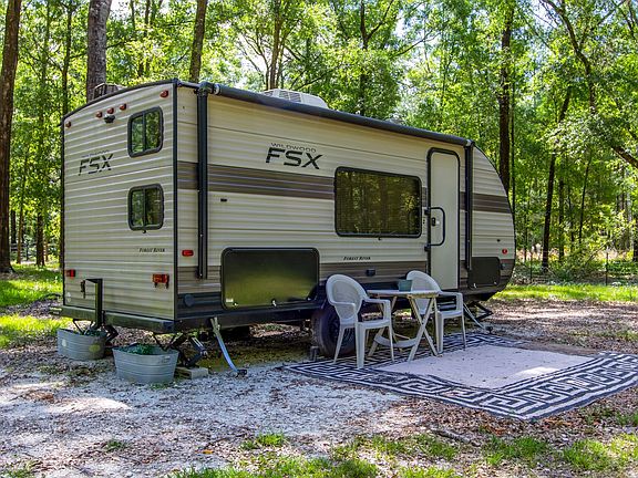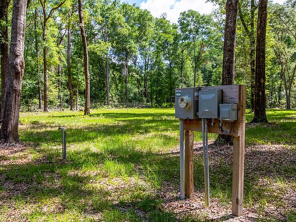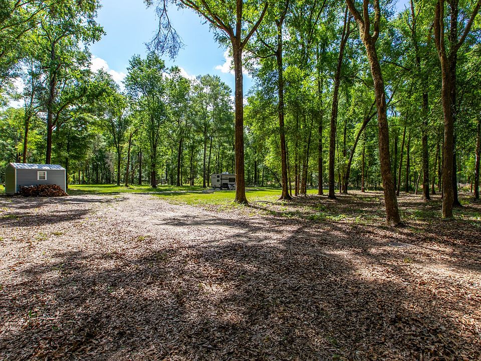3.99 acres with a 2020 camper and storage shed. This property is turn key- just bring your clothes! Fenced and cleared with 100amp power service, well and septic (large enough for a 4 bedroom home) this acreage is the perfect mixture of cleared acreage and natural woods. Located on a corner lot just minutes from the Suwannee River. No flood zone and minimal restrictions (mobile homes are allowed). No HOA.
