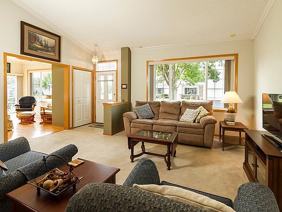 Everything you need on one level. This oversized end unit offers a great layout, vaulted ceiling ,sunroom to enjoy your morning coffee in and keep your plants through the winter. Large patio is a great place to relax in the outdoor space of this quiet neighborhood. Insulated and heated garage, separate formal dining and eat in kitchen, large master suite with jacuzzi tub and separate shower. Close to walk trails, parks, shopping, medical facilities and easy access to the freeway!