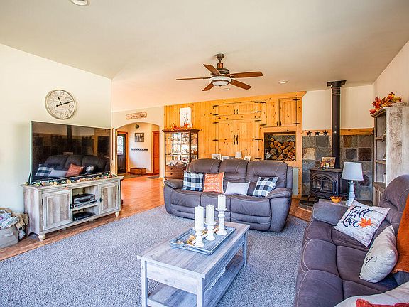 QUALITY CUSTOM-BUILT rancher with fully finished basement on just under 5 acres with timber, pasture, views and great county road access. Home affords vaulted ceilings, expansive living room with covered decks access. Beautiful country kitchen with maple cabinets, island, Corian counters and pantry with lots of storage for all your culinary delights. Spacious dining area allows great options for entertaining. Main floor master suite with double vanity and walk-in closet. Finished basement with family room, bedrooms, bathroom and extra storage. Fully fenced garden space, attached 2 car carport, 816 sq feet detached shop AND a 3120 square foot shop with high ceilings for all you recreational storage needs.
