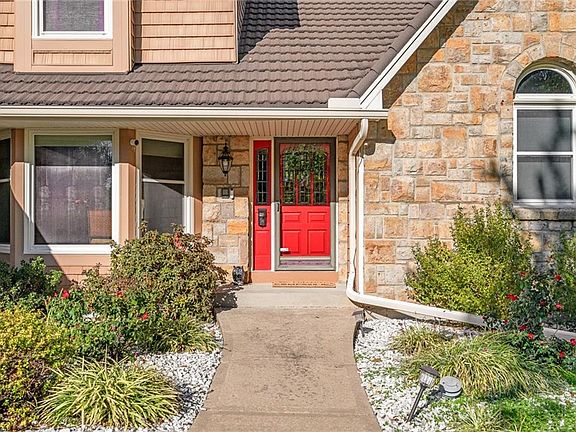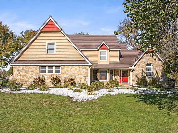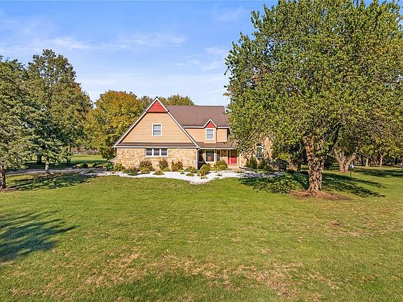 Welcome to your dream home in the highly sought-after Mill Creek Farms neighborhood, nestled on 2.8 acres of picturesque landscape. This remarkable residence boasts a main-level Primary Suite with a newly remodeled spa-like bath with walk-in tiled shower and a spacious walk-in closet. Entertain in style with a formal dining area, a grand great room featuring a coffered ceiling and a striking floor to ceiling stone fireplace. The updated white kitchen is a chef's delight, equipped with three ovens, a gas range, and top-of-the-line appliances. The expansive breakfast room offers a breathtaking view through a wall of windows and leads to a vast back patio, that spans the back of the home, a perfect place for outdoor gatherings. You will love the open space and privacy in the backyard and the kids will love the treehouse. Upstairs, three generously sized bedrooms provide ample space for family or guests. Unfinished storage space awaits your creative vision for expansion. The basement offers a finished rec room or workout area, a wine room, and abundant storage with the potential for further customization. With an extra-deep three-car garage and a picturesque, tree-lined driveway, this is truly a warm and inviting "Welcome Home." Don't miss the opportunity to make this your haven in Mill Creek Farms. Community features community pond with trail, private roads, community park area with playground, tennis courts and optional gated access Lone Elm for convenient access to the award-winning, premier Olathe Schools - Meadow Lane Elementary, Prairie Trail Middle School and Olathe Northwest High School. Located just off of K10 and Woodland, there's great accessibility to highways just minutes from it all!