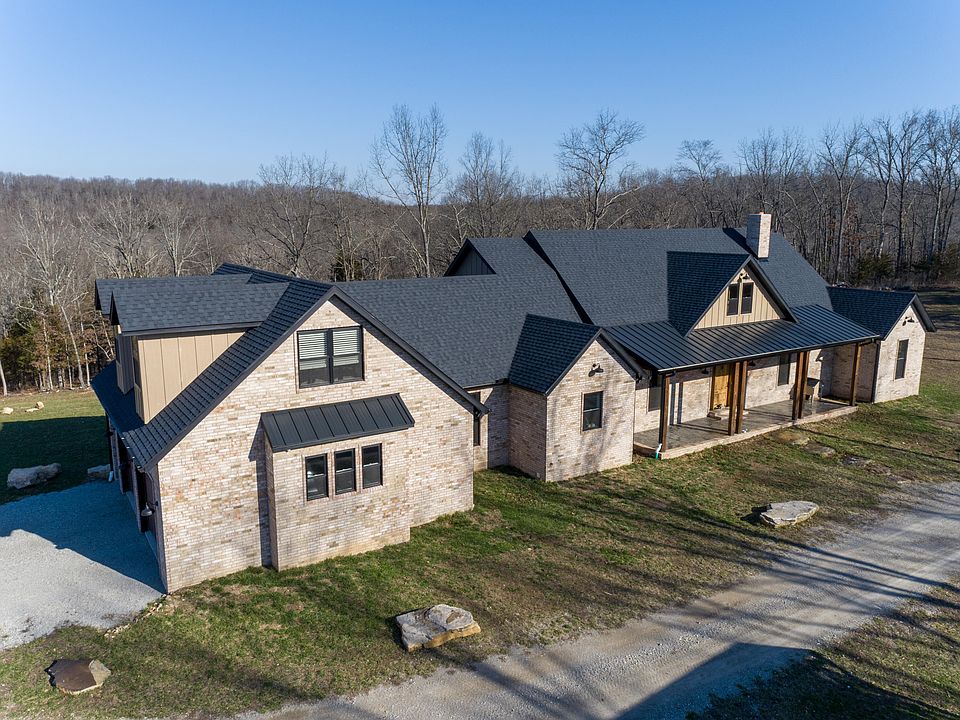 Custom-quality brick home includes a 3000 sq ft. open floor plan with three bedrooms and 2.5 baths. The great room's focal point is a brick full masonry wood-burning fireplace, expansive vault ceiling, and skylights. The kitchen's custom wood house cabinetry has 52 in. upper cabinets, all soft closed with pull-out shelves on the lower cabinets. Quartz countertops, all Bosch appliances, propane oversized cooktop with pot filler, and a double oven including a speed cooker. Hardwood floors and 8 ft. custom knotty elder doors. Ceilings are 10 and 11 ft. with some very tall vaults. Divided floor plan; the master has a luxury bath and doors leading to the back screened-in porch. Two bedrooms have a jack-and-jill bath and an additional playroom or office. All bedrooms have walk-in closets. The family /game room is upstairs--large laundry room w/ wash sink, walk-in pantry, and a two-car attached garage. The whole house is networked. Speakers in ceilings in the great room and on the back porch. The screened back porch has a built-in propane grill and exhaust hood. The shop has 750 sq. ft. charming in-laws quarters/apartments with a private entrance. The shop area is fully insulated and drywalled with 12 ft drive-thru doors and a large open loft area for storage above the apartment. The greenhouse has water and electricity, and a raised bed garden is fenced to keep out wildlife.The chicken coop is 10x30 with a 20 ft. enclosed run. All this on 214 acres. If you are looking for a place to live that is secluded, peaceful, and quiet and where you can enjoy wildlife and spring waters, you have found the place. Bring the family; there is an in-law quarter with two bedrooms, where they can have their own space. Hiking, exploring, hunting, and relaxing in the country make the best place to live. About 20 min from Ava