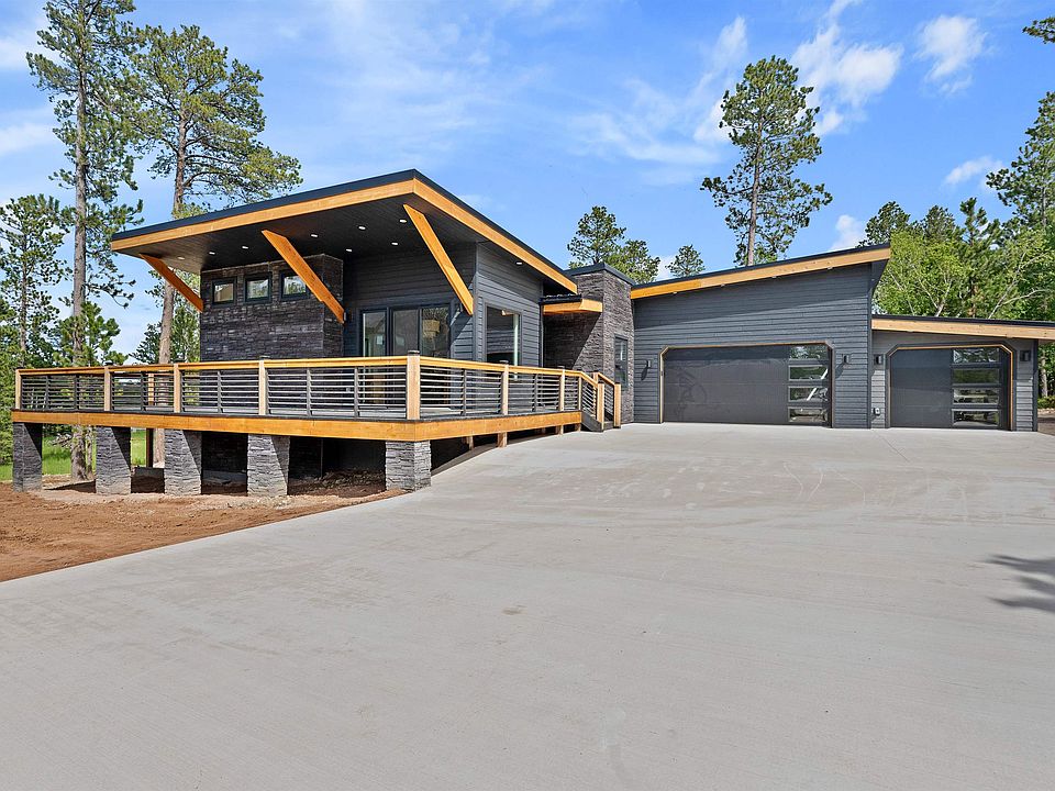 Listed by Jenni Sneesby, 605-645-1181, Engel & Völkers. 21247 Cozy Court is a TURN KEY, fully furnished, stunning, modern cabin retreat nestled in the scenic beauty of Powder House Pass just outside of Lead. This property offers a perfect blend of mountain charm and contemporary elegance, boasting 5 bedrooms, 4 bathrooms, and a spacious 3-stall, oversized garage. Step inside to the inviting ambiance of the open-concept floor plan that seamlessly combines the living, dining, and kitchen areas. The soaring ceilings, adorned with exposed wooden beams, add a touch of grandeur to the modern design. One highlight of this remarkable property is the presence of not one but two master suites. The additional bedrooms are generously sized, providing plenty of space for guests. Outside of one of the six sliding doors, the expansive wrap-around deck and beautiful teak patio offer the perfect spaces for dining, relaxation, or simply enjoying the natural beauty of the surrounding landscape. Located in the desirable Powder House Pass development, this property offers easy access to a wide range of recreational activities. Enjoy hiking, fishing, skiing, biking, snowmobiling, ATV’ing and much more, all within reach of this enchanting retreat. Embrace modern cabin living at its finest and indulge in the serenity and luxury this property has to offer.