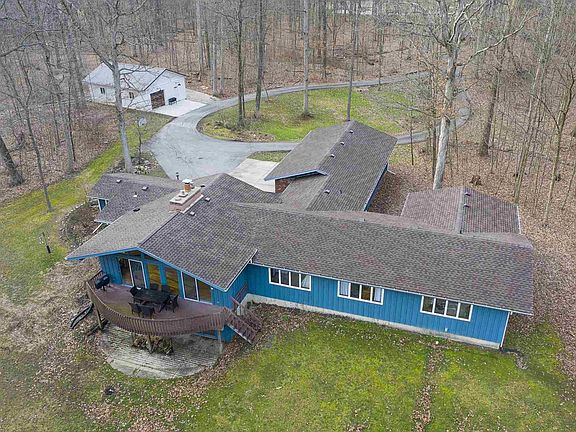 BRAND NEW ROOF AND HOOKING UP TO CITY SEWER! You will LOVE this remodeled, quality, sprawling ranch on a walkout! A quiet paved lane leads you home to 3 gorgeous acres of wooded beauty with a creek. There is room for everyone here, 4 large bedrooms, 2.5 baths, 3 car garage/possibly 5. A spacious entry welcomes you home. Great architectural style with soaring wood cathedral ceilings, a floor to ceiling brick fireplace, wood floors and a window-wall, make up the homey yet open, great room and formal dining. Open up the window wall to the deck, and enjoy grilling and outside entertaining overlooking breathtaking views. Grabill custom cabinets, an island w/breakfast bar, a dinette area and stainless appliances are only a few of the kitchen amenities. Enjoy the well lit, heated sun room/den by the kitchen. Head down the hall to the bedroom wing and find a large laundry/mud room with built-ins. The master bedroom has corner views, a walk-in closet and master bath. Other bedrooms have walk-in closets with new, custom built drawers and shelves. The finished W/O lower level has a wood burning stove in the fireplace, large windows, nice built-ins and sliding patio doors to a covered patio. There is extra storage too. The 4th bedroom is a new addition. There is new carpet throughout. FIVE, new, high quality garage doors were also recently installed. Don't miss the incredible new 24x34 Heated 2 car Garage/Shop. Much more. Must see!