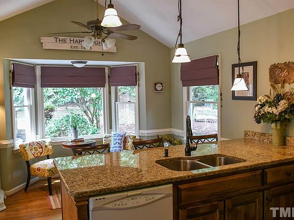 Beautiful secluded 3 bedroom home on 1.7 wooded acs close to Wake Tech. Includes oversized detached garage/workshop with walkup attic, large deck, screened porch, storage building and fire pit. Inside has 1st floor master, hardwood floors, granite counters in kitchen & master bath, large bright open kitchen, very large dining room. Home is truly move=in ready.