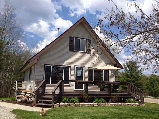Immaculate 3 bedroom, 2 bath Chalet sitting on a 3/4 acre lot. that slopes to a beautiful treed setting with fire pit. A total of 1850 sq ft of living space and close to all amenities. Full walk-out basement with ceramic tile flooring. A bath on each level and tons of storage throughout. A 30x30 oversized garage has plenty of room for all your equipment and cars. Enjoy all the amenities of Sugar Springs. Golf, indoor heated pool, tennis courts, Bocce Ball and two all sport lakes with beach clubs. 3500 ft Grass Airpark.