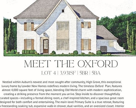 Nestled within Auburn’s newest and most sought-after community, High Grove, this exceptional luxury home on 1 acre Home site by Lowder New Homes redefines modern living. The timeless Oxford Plan, features almost 4,000 square feet of living space, blending Old World charm with modern sophistication, creating a striking presence from the moment you arrive. Step inside to discover thoughtfully curated spaces—including a formal dining room, a chef-inspired kitchen, and a spacious great room