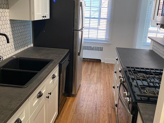Off-street parkingTile backsplashPlenty of closet spaceTop floorCabinets in kitchenHardwood floorsFront and rear entry