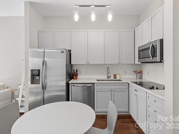 Rare condo in the heart of Southend! This recently renovated home surpasses your expectations! Plank flooring throughout and all new lighting fixtures provide a cozy, yet spacious setting. Kitchen boasts upgraded stainless appliances, elegant herringbone backsplash and quarts counter tops. Unique computer nook that can also serve as your dry bar for all entertaining needs. Bathroom has been upgraded with oversized vanity and walk-in tiled shower. Unit overlooks quiet courtyard and only 2 blocks away from East/West blvd Light Rail! Walking distance to the all new shopping at Atherton Mill. Easy parking in the gated parking deck. Key fob access. Pet friendly!