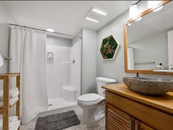 Open layoutBright industrial loftSoaring ceilingsStainless steel appliancesSleek modern bathroomStone vessel sinkExposed ductwork