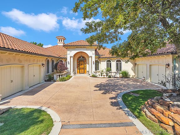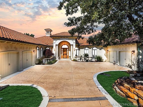 Jenks NW 2.6 acres . Gated, private, secluded & wooded. 10 Min to downtown, 1 mi to Tulsa Hills. Luxury neighborhood, only 8 homes on large lots. Backs to Stone Creek Golf Course (Page Belcher). One story. Superior construction, copper gutters, (2) 40 gal water heaters, Tile roof, 4 car garage, stainless, granite, abundant storage & media throughout. Formal living, formal dining W/Renaissance Mural, family room, 3 beds plus large bonus/office. Wooded and native rock surround property. Two verandas to enjoy the sunset. Two fire pits.