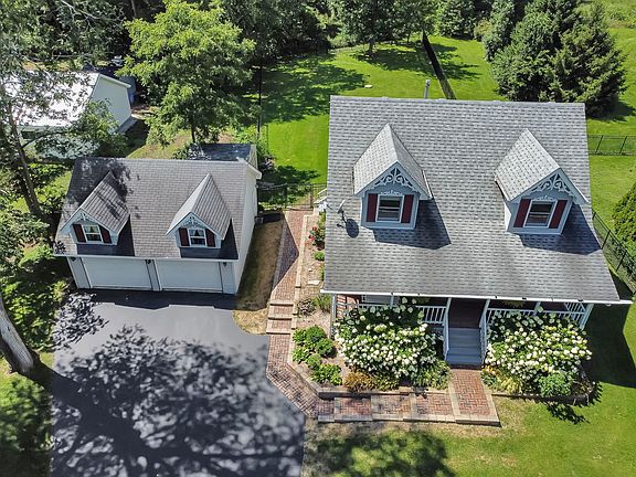 Well-kept, private, and ready to move in! This house has 3 bedrooms, 2 bathrooms, and sits on over an acre of land. You'll notice its charm right away with a porch swing by the front door. The living room is spacious and great for gatherings. The kitchen has lots of cabinets, white appliances, and a dining area with views of the backyard. A bedroom and bathroom on the main floor make this a great long-term home. The laundry room is also on the first floor. Upstairs, there are 2 large bedrooms with ample closet space and another full bathroom. Outside is a nature lover's paradise. Relax, have fun, and enjoy the fenced backyard with a big patio and pergola. Just beyond the fence is the creek that runs through the property. The separate 2-car garage and shed are perfect for storage. Close to the Old Plank Road Trail, downtown Frankfort, eateries, shops, and top-notch schools. Don't miss out - set up a showing today. This home is a true gem!