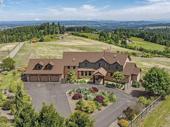 Wake up to sweeping views and the quiet rhythm of Chehalem Mountain life. Behind a gated entry on a fully fenced acre with adjoining pasture and replanted timberland, this custom-crafted estate is more than a home, it’s a retreat for the soul. Designed for those who crave beauty, space, and serenity, every detail invites you to breathe deeper and live fuller. The great room stuns with 28-foot ceilings and a wall of windows framing panoramic Cascade Mountain and territorial views, putting nature’s artwork on full display. The open-concept gourmet kitchen features slab granite countertops, wild cherry cabinetry, and generous space for hosting and connection. For cozy evenings or weekend movie marathons, the media room offers a 100-inch screen, premium sound system, and its own kitchenette. Three ensuite bedrooms provide spa-like privacy, each with heated tile floors and heated towel racks. With six-zone HVAC for energy-efficient comfort, and thoughtful design throughout, this home lives as beautifully as it looks. The original farmhouse and a detached shop adds many possibilities with multigenerational flexibility! Whether you’re gathering on the patio at sunset, enjoying quiet mornings with coffee and views, or welcoming guests to stay awhile, this is a place where memories are made. Tucked into nature, yet just minutes from Sherwood, Newberg, and Hillsboro, the location blends peaceful living with easy access to the high-tech corridor and wine country. Come experience a lifestyle that’s as elevated as the view.