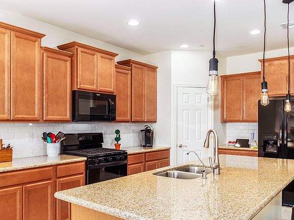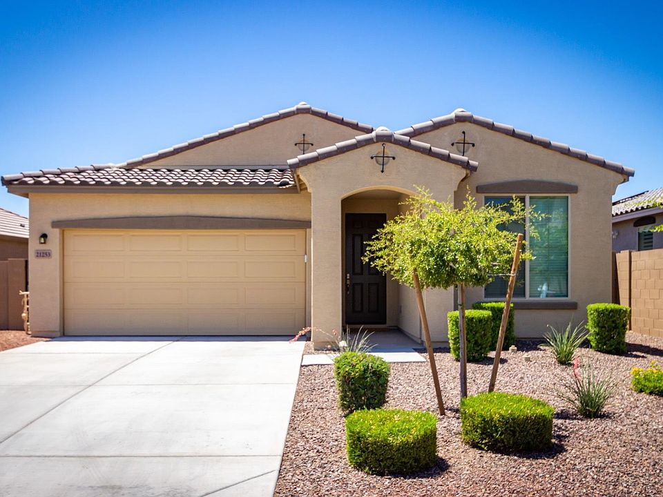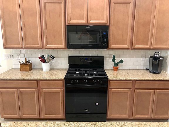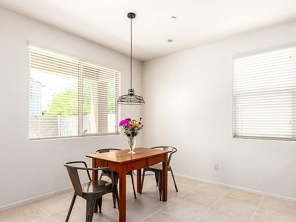 Impeccable 2 Bed + Den with private pool nestled in a quiet mountainside community with fun pool complex. Built in 2018. Manicured desert landscaping. Open concept with neutral palette & 18'' tile in all the living spaces. Impressive Kitchen with granite dining bar & counter tops accented with subway tile backsplash. Sleek black gas range, microwave & refrigerator. Walk in pantry. Dining area with wire cage light fixture & pool views. Open Living Room with cooling fan & sliding door to pool area. Master Suite has bath with double sinks & beautiful walk in shower with decorative tile surround. Double doors lead to Den. Full 2nd Bath. Washer & dryer included. Enjoy hours of fun in your private pool & covered patio. Nearby school & community pool with splash pad & playground. Close to I10.