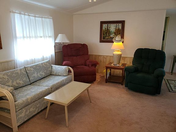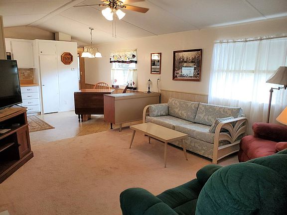 THIS HOME IS ON LEASED LAND WITH A MONTHLY LOT RENT OF $402 AND THAT INCLUDES WATER, SEWER AND TRASH. SUPER CUTE SINGLE WIDE WITH 2 BEDROOMS AND 2 FULL BATHS WITH NEWER HVAC UNIT, FLORIDA ROOM AND MUCH MORE. OPEN, BRIGHT AND READY FOR YOU!!! THIS HOME IS COMING WITH A FEW FURNISHING. WAIT TO YOU SEE THE LOT, IT'S HUGE. LOCATED IN HISTORIC BROOKSVILLE IN 3 SEASONS MHP. A 55+ COMMUNITY. ALL WINDOW TREATMENTS WILL REMAIN UPON REQUEST. LIVING ROOM 13 X 14 Large, open and bright with carpet ( in great shape), lighted ceiling fan. With the high vaulted ceiling it looks much bigger. Furniture remain is a pretty palm tree leaf sofa, green recliner chair, one lamp, coffee table and a TV stand. KITCHEN Opens to living room with a small credenza to separate the two. It is portable and can be moved. Kitchen has vinyl flooring, double sink with viewing window, gorgeous tile back splash, tons of storage and a good size pantry. Eat-in area is 5 x 6'5" and is off to the side of the kitchen with a huge bright window and a silver hanging light fixture. Appliances include a GE coil top stove, Frigidaire top freezer refrigerator, Samsung stainless steel above stove microwave and a stainless steel GE dishwasher. MASTER BEDROOM 11'7" x 12 King size master bedroom with carpet and a built-in open closet with a couple of drawers. A TV and lamp is remaining. MASTER BATH Huge bath with vinyl flooring, a newer single sink vanity with a newer massive medicine cabinet, a matching above the toilet cabinet and a tub/shower with grab bars that has recently been epoxied. GUEST BEDROOM 9'8" x 13 This bedroom can fit a full size bed and has carpet, lighted ceiling fan, a built-in closet. En suite to main bath. Bedroom is coming with a twin size bed, a small wood dresser and a TV stand. MAIN BATH Full size with newer single sink vanity, medicine cabinet, vinyl flooring and a tub/shower with grab bars. Linen closet is right outside the bathroom. LAUNDRY Off the hallway with Whirlpool washer and dryer, storage and a utility closet in the hallway. Second entrance in to the home is in the hallway too. FLORIDA ROOM 11 x 17'6" Great place to people watch. You also have a view of the pond and the birds. Located off the driveway with vinyl easy slide windows, lighted ceiling fans, pull down blinds, indoor/outdoor carpet. Newer addition and well worth it. A red recliner chair and white china cabinet are included. EXTERIOR 2 car driveway 8 x 10 storage shed with workbench inside 2016 Hvac unit that is used 3 months a year and serviced yearly The roof is metal Huge lot with lots of space in-between the homes Behind the shed is a perfect area to put a patio and watch the cows in back of the community. 3 Seasons MHP is located in Brooksville. Lot rent is $386 and that includes water, sewer, and garbage. Park offers lots of activities to keep you busy. A heated pool, fitness center and catch and release pond are just a few of the amenities. Close to shopping, medical and easy, short drive to beaches. All information is deemed reliable but not guaranteed and should be independently verified through personal inspection by appropriate professionals. American Mobile Home Sales of Tampa Bay Inc. cannot guarantee or warrant the accuracy of this information or condition of this property. The buyer assumes full responsibility for obtaining all current rates of lot rent, fees, and pass-on costs. Additionally, the buyer is responsible for obtaining all rules, regulations, pet policies, etc., associated with the community, park, or home from the community/park manager. American Mobile Home Sales of All listing info Tampa Bay Inc is not responsible for quoting of said fees or policies.
