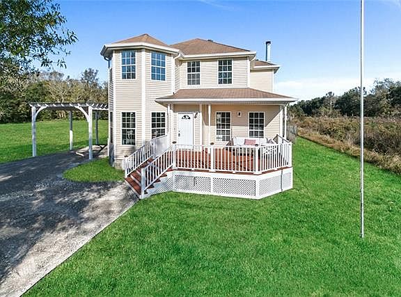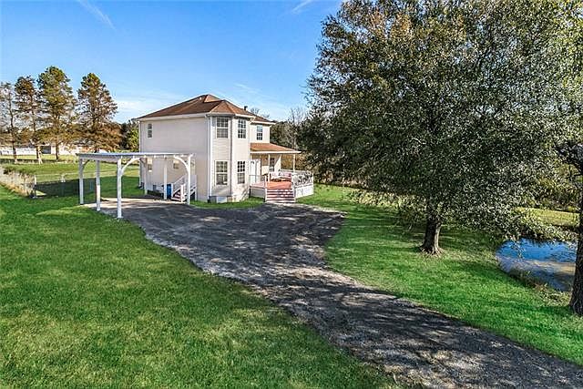 Gorgeous Victorian Country Home! This 4 Bed, 3 Bath southern charmer features spacious living room w/ electric fireplace & custom cypress mantle. LifeProof Vinyl floors throughout in a Rustic Oak finish.Kitchen features granite counter tops, soft close cabinetry, Recessed Fridge & large pantry. Master features a unique sitting room off the bedroom with lots of natural light. Ensuite bath with custom tile shower. Front and rear porches, custom pergola carport. (Pond is owned by neighbors, photo to show view)