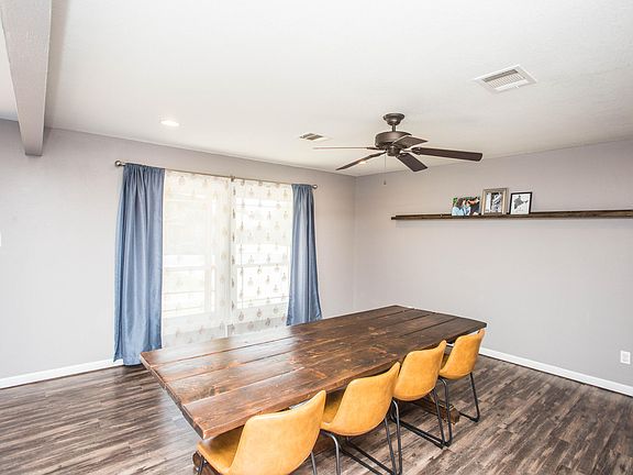 Half a block east of the pond and park, you'll be greeted by the blue front door and wood beams of this charming home. As you step inside to the giant flex room, the luxury vinyl plank gleams from the updated windows that usher in natural sunlight throughout. This room has been used for dining, family game nights, play and study. From the huge flex room, you'll walk into the living room centered around a fireplace and more big windows. A cozy dining nook sits adjacent to the kitchen and living room, and you'll find lots of storage areas throughout the home. The guest and primary bedrooms are spacious with more great closet space and plenty of natural sunlight. The backyard is flanked on the east with a metal fence and a large storage building sits on the west side of the yard. Priced to sell and offering a $5,000 credit to the buyer for plumbing upgrades or closing cost assistance. This one literally feels like home.