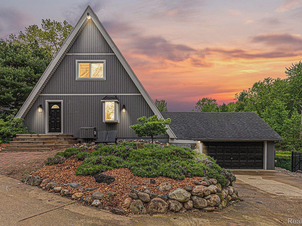 Welcome to your own private retreat! This unique chalet-style home is an amazing opportunity, set on over 3 acres of picturesque property with a beautiful treated swimming pond, private beach, and cozy bonfire pit. Spanning more than 2200 sq ft, this charming home features 3 bedrooms and 2.5 baths. The main floor includes a kitchen with granite countertops, a charming built-in desk area, a family room, and a dining room. The lower level boasts a spacious primary bedroom with a walk-in closet and a separate office. On the upper level, you'll find 2 bedrooms, a full bath, and the cutest loft. Don't miss this chance to own a piece of paradise!