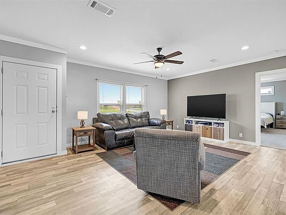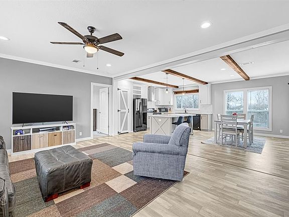 Charming home-Palm Harbor Horizon 68 plan that has 4 spacious bedrooms, 2 baths, and 2 living areas. You will love the modern farmhouse finishings and the bright airiness of this home. It features an ample amount of storage, two water wells (water is 11 gallons a minute), a large island in the kitchen, the laundry room has plenty of room for an extra refrigerator or freezer. A large master closet, double vanities in the master bathroom, a barn door, and vinyl plank wood look tile. There is a storage building in the fenced in backyard. This all sits on 1.73 acres! Blanchard address, Dibble schools. Great location-easily accessible to highways and schools!
