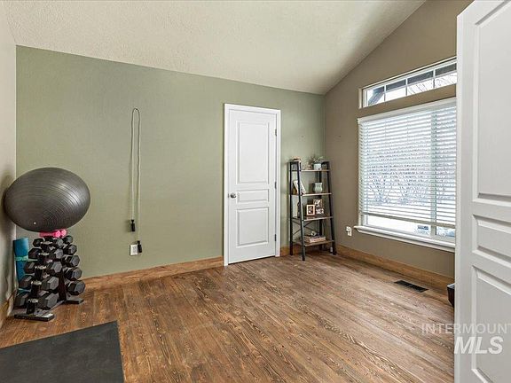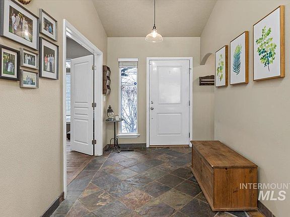 Tons of character in this charming Kuna home! Single level with upstairs bonus room - decked out with a new bathroom, stone wall and wet bar. The great room features a gorgeous stone fireplace & vaulted ceiling, 4th bedroom upfront makes a perfect office, gorgeous slate tile and real Douglas Fir hardwood flooring. The gourmet kitchen includes a double oven, pantry, granite composite sink and breakfast bar. Split bedroom design with spacious master suite with double vanity and walk in closet. The 3rd garage bay has a shop area with a workbench that will stay and two 50 amp outlets, RV parking, wide gate and storage shed. This home was owned by a contractor that put unique touches throughout!