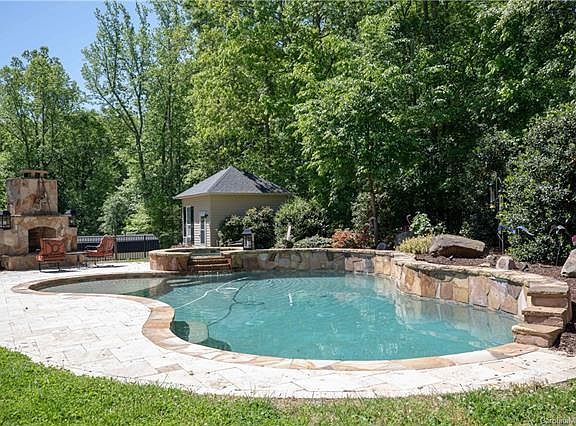 Each detail will have you head over heals in love with this home and almost 3 1/2 Acres! A picture perfect landscaped backdrop to your own personal oasis with salt water pool, outdoor fireplace and a place to park that RV with 50 amp service/water! The pool house and detached storage units are connected to power. That sunroom with the warm summer rays and gorgeous views will be the place for morning coffee. Master and 2 bedrooms on main, 1 bedroom/bath up and home office. Kitchen with 5 burner cooktop and double ovens. Let this be your paradise!