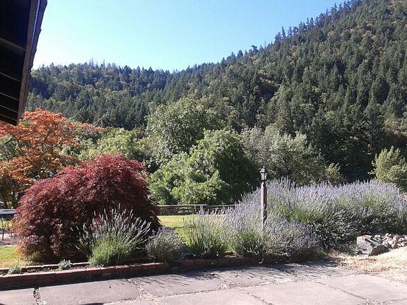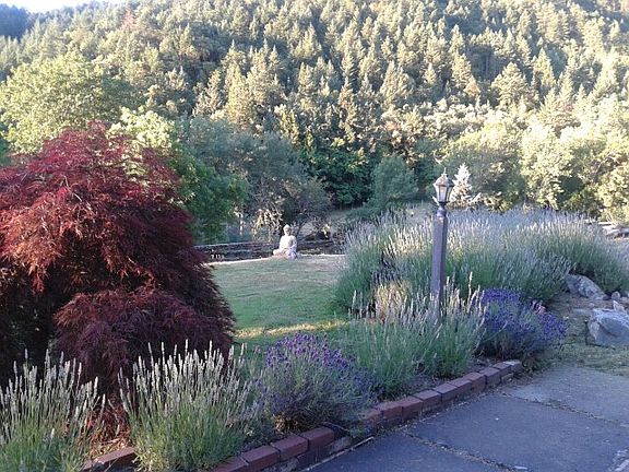 2128 Anderson Creek Road Talent, OR 97540 Twenty country acres with a gated driveway in Talent, Oregon are situated close to Ashland and Medford. The Rogue Valley International Medford Airport makes air travel easily accessible. The home was built in the early 1950s by a member of the Norton Lumber Company. The interior is largely heart redwood with vaulted ceilings in the open dining/living room area. This home has three working chimneys, original cabinetry and a modern heating/air conditioning system. A covered porch runs the entire length of the home, with a south facing sunroom sectioned off. The second home on the lower ten acres lies above the ranch home. Built in 2010, it is a cottage style dwelling approximately 780 square feet. Jackson county designates this as a Detached Living Space. It is modern with high ceilings and long-distance mountain views. A seasonal creek runs the entire length of the property, feeding the recreational/irrigation pond. Whitewater ripples exist along the creek and a meandering waterfall spills from the pond outlet, announcing the hillside Japanese garden. Walking paths invite one to explore and enjoy the pond, creek, bird habitat and garden area. An old barn exists along the eastern border of the property. Mature Japanese Maple, fruit and nut trees dapple the land and blackberries thrive along the banks of the creek. A cedar split rail fence separates the main home and landscaped yard from the agricultural acreage. The upper ten acres have Measure 49 development rights, as two five-acre parcels. The forest is mostly conifer and madrone mix. It has been recently thinned and dead trees removed. A firebreak road exists, providing a walking path in natural beauty. Whether in the forest above or the ranch house below, sight lines are unencumbered by neighboring residences. This park like property has been photographed by Harry & David for a Fall magazine cover and by the Medford Mail Tribune for a feature article in Home Life magazine, April 2006, entitled “A Garden for Enlightenment”. Viewed by appointment only for asking price qualified buyers .Leave a message with name/number & best time to return call (w/ your time zone if out of Pacific Daylight Time.) No seller financing