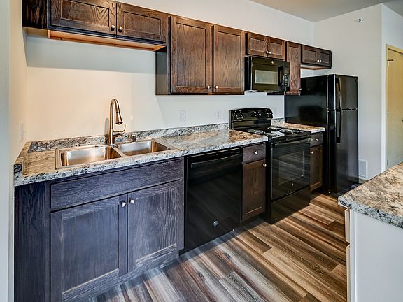 Sleek two-tone cabinetsBrand new appliancesMarble countertopsAmple storageNew plush carpetingNew bathroom